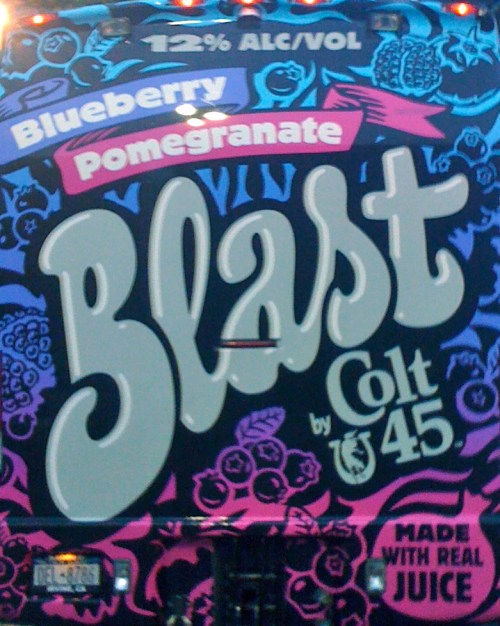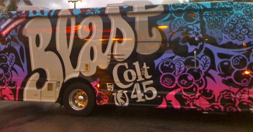 Obviously, I champion all sorts of abuse. I’d even champion antioxidant abuse except I can’t afford the habit. What I cannot support slash abide is Colt 45 being portrayed as the lesser of evils available at your local liquor store because they’ve added blueberry juice. But… do I think it’s amazing that they’ve put millions into this campaign? Yes. Do I want to hear rap songs talking about fighting cancer while also inflicting cirrhosis upon one’s liver? Yes! Did I shout cries of joy in the CVS parking lot when I saw this truck? Oh, hell yes. Do I still think it’s the most amazing ploy since Four Loko to get amateur drinkers savagely intoxicated? Absolutely.