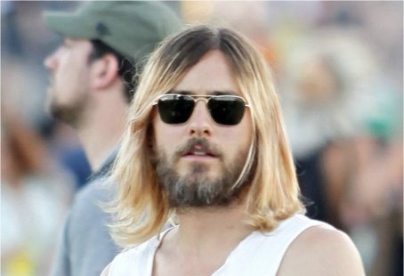 The bathroom is long, like a bar, and hooks at the end into a toilet and a mirror. That’s where I find Jared. He wears a beard and tiny jeans, which hang loosely on his gaunt frame. Jared Leto is an old man now. He’s sinewy and his eccentricities make him look less like a heartthrob and more like a deranged cult leader.