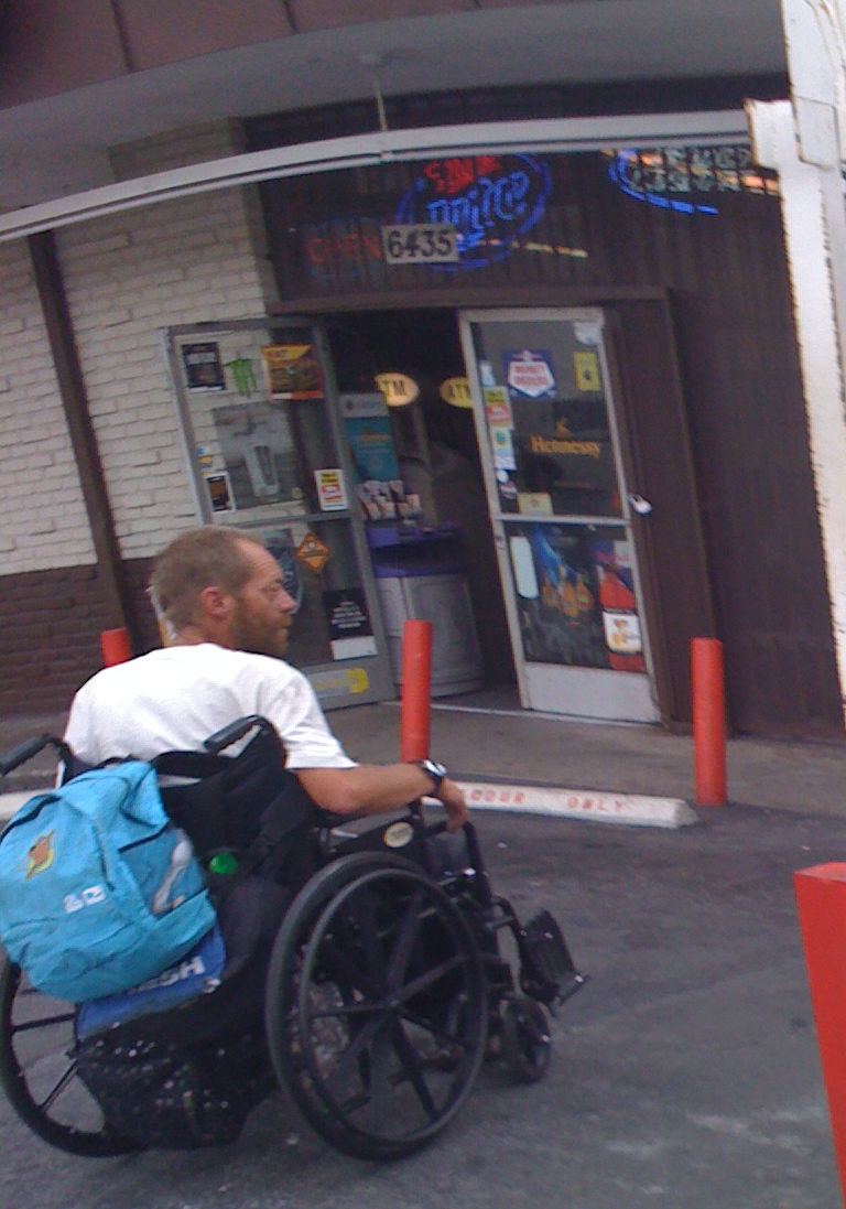 This morning, I saw the couple from across the street. He’s an under-appreciated, but traditional alpha male of sorts. He helps her survive, nursing her with Moscoff Vodka, pushing her to and from their bed of third-class mail and freeway compost. She screamed something from her wheelchair throne and spit on the man, who sat beneath her on the sidewalk.